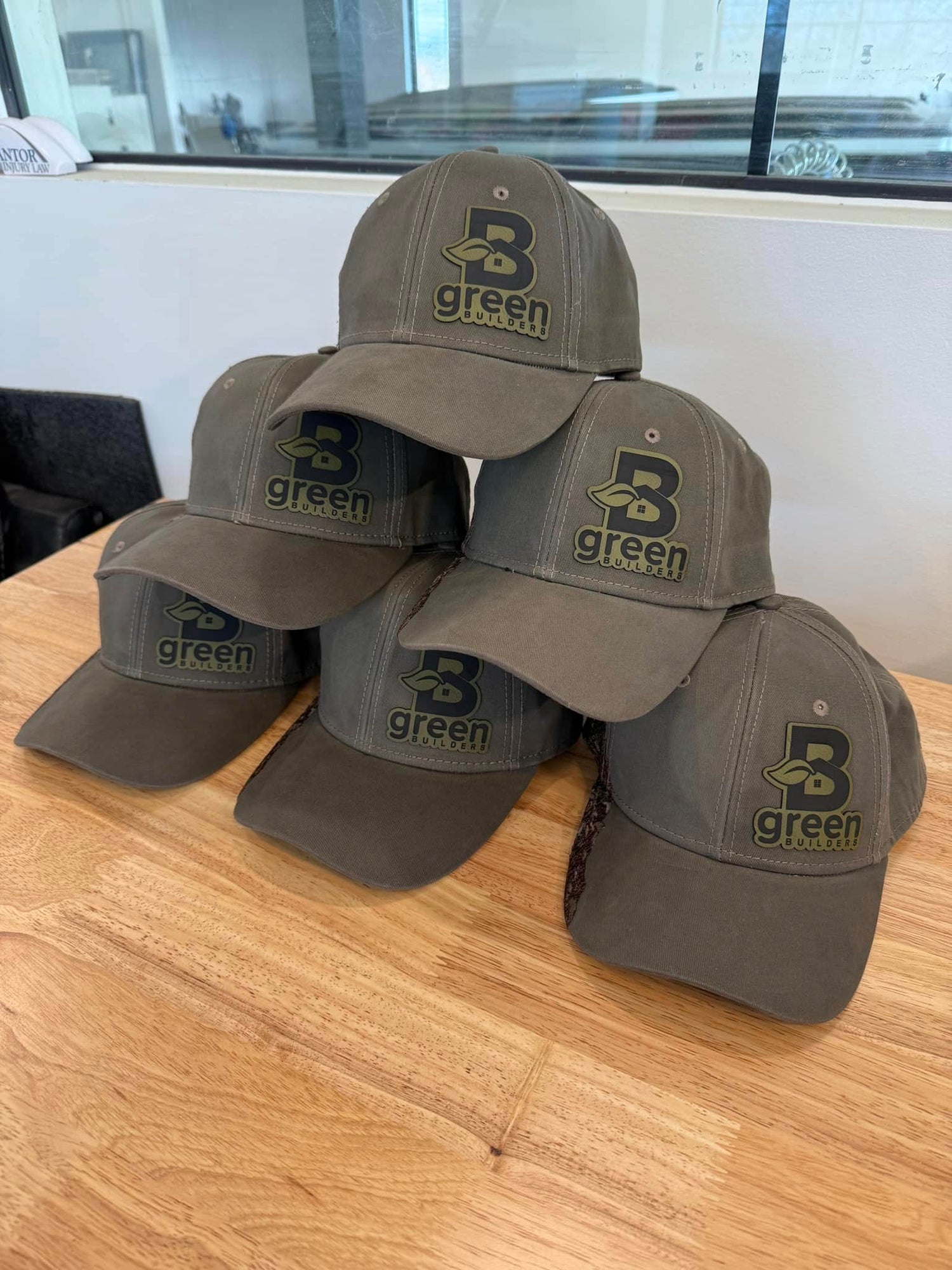 The hats to the left were made for our friends BgreenBuilders. We love to make new apparel for a business to sport, with quality that lasts even on a jobsite.